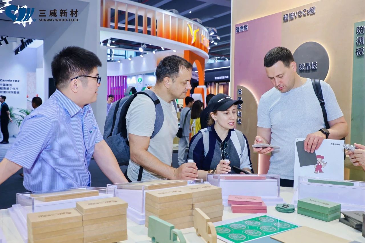 展會(huì)人潮涌動(dòng),三威展位人氣旺盛。領(lǐng)導(dǎo)、行業(yè)專家,全球客商先后到我司展位參觀指導(dǎo);觀眾駐足了解纖維板產(chǎn)品,講解員細(xì)致介紹獲好評(píng),洽談區(qū)滿座,共探合作與行業(yè)前景。